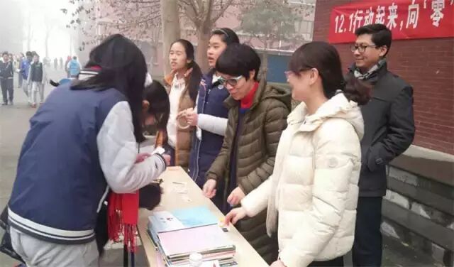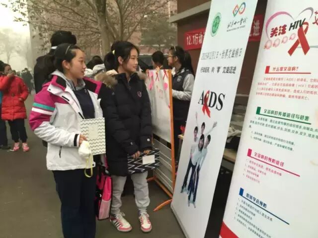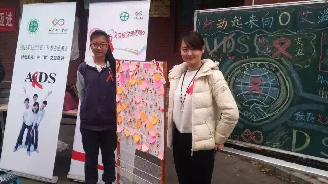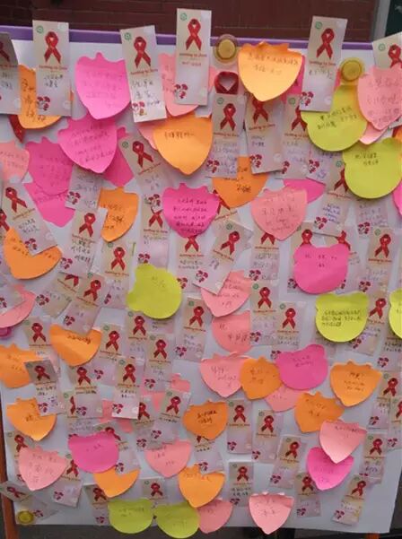 今天中午的北京十一学校校园虽然雾霾笼罩,但在校医务室门口却是充满了阳光的笑容。老师、同学们陆陆续续经过宣传点,驻足宣传板前认真阅读。当他们得知今天是“世界艾滋病日”时,都非常踊跃的在便签贴上写下他们对艾滋病预防的想法和建议,以及他们对艾滋病患者满满的祝福:“愿更多人们接受你们”“加油,祝你们早日康复!”不一会儿,我们的爱心板就贴满了同学们的爱心贴。这些发自孩子们心底的最诚挚的祝福,让我们在寒冬的雾霾中感受到满满的温暖和温馨……