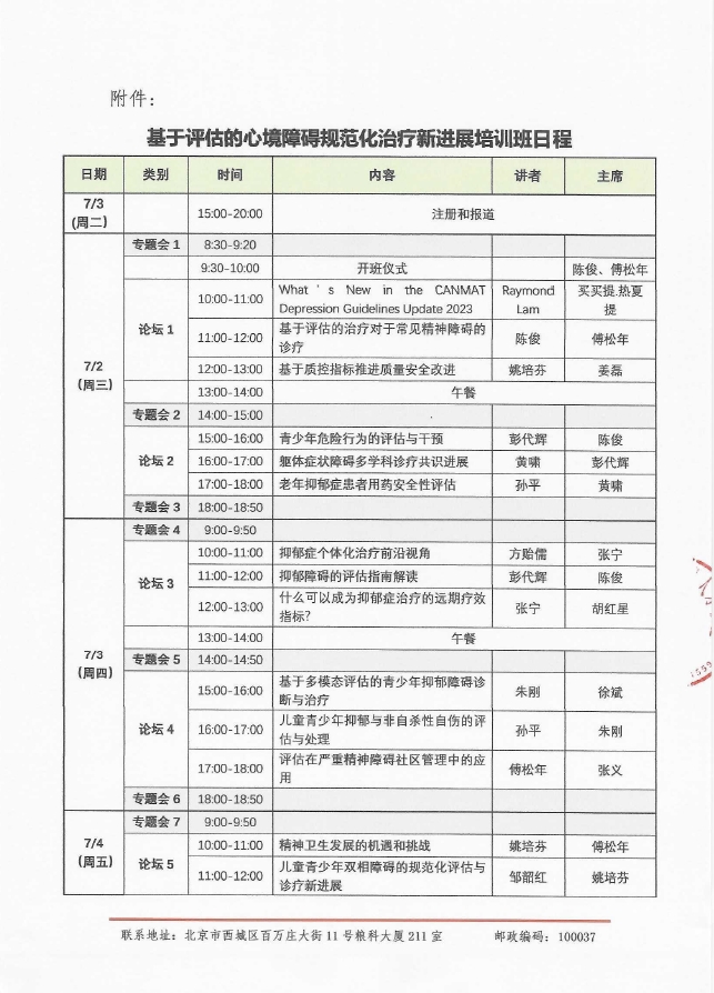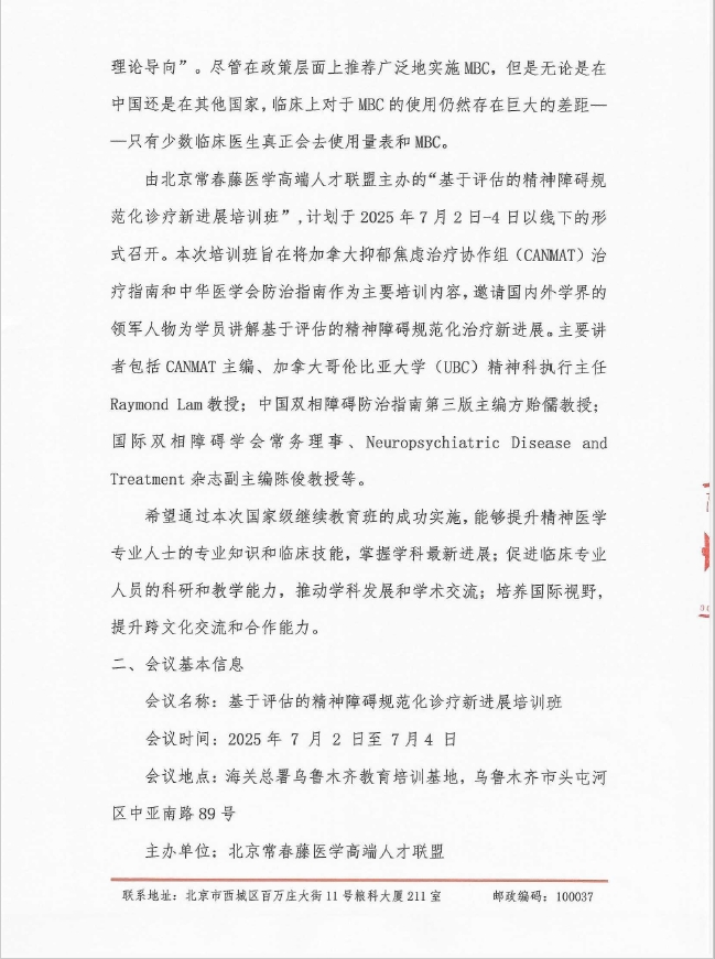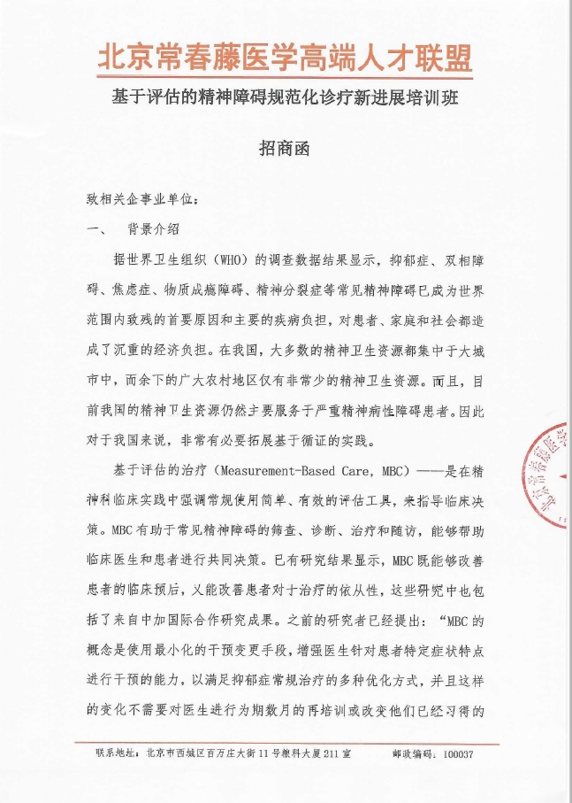 基于评估的精神障碍规范化诊疗新进展培训班招商函